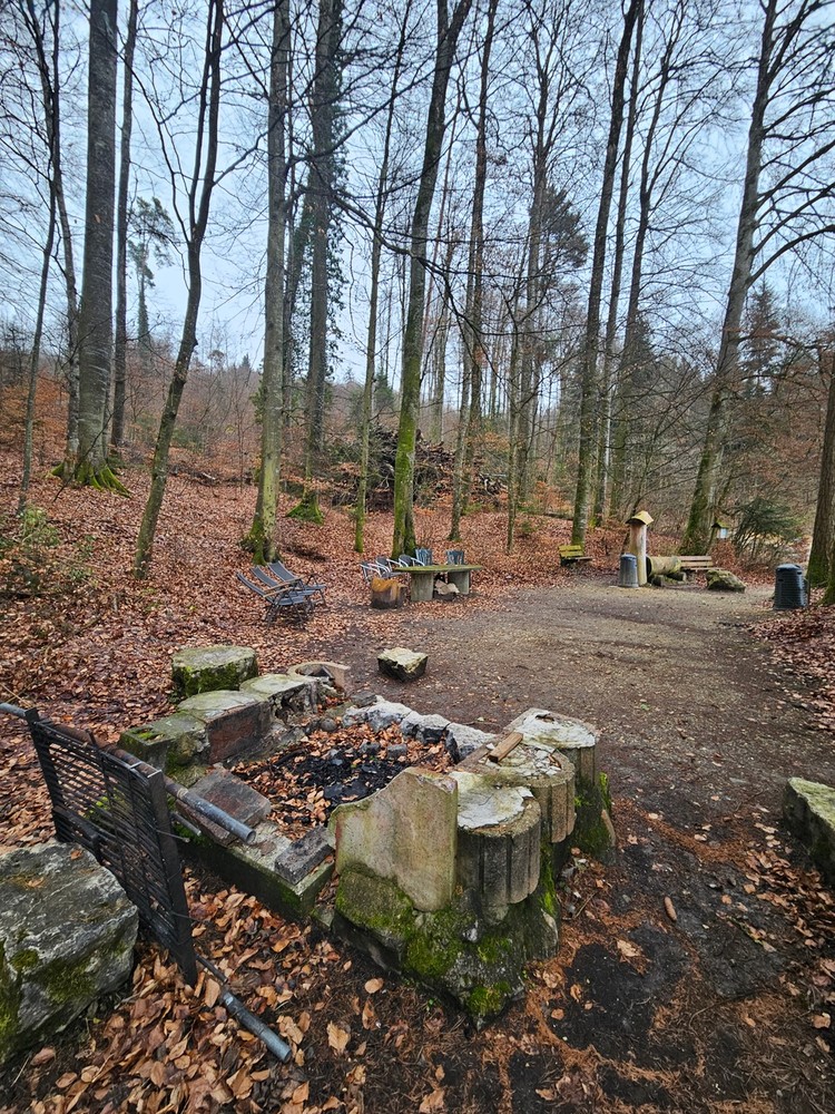 - Point B : Ici se trouve la cabane des pompiers, un endroit chaleureux que l’on peut louer pour des fêtes. Continuez sur le même chemin en contournant la cabane. Plus loin, prenez le premier sentier partant sur la gauche, descendant vers une intersection avec une borne, puis partez à gauche. Vous êtes maintenant en lisière de forêt, tournez à droite et continuez votre chemin jusqu’à la place de pic-nic.