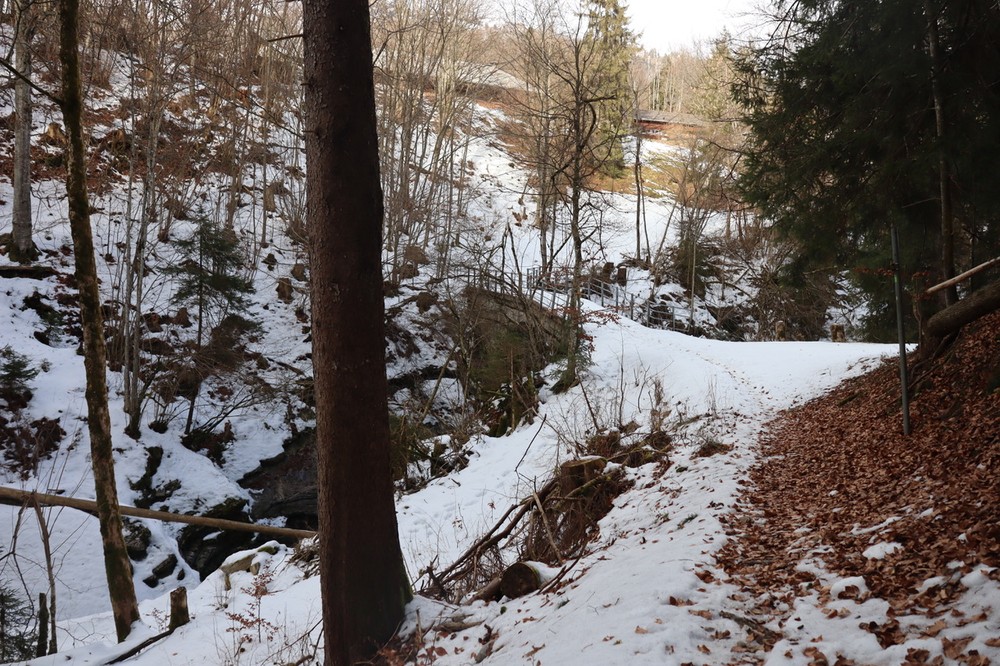 - Traversez le torrent sur le pont et continuez sur le chemin menant vers le bas.